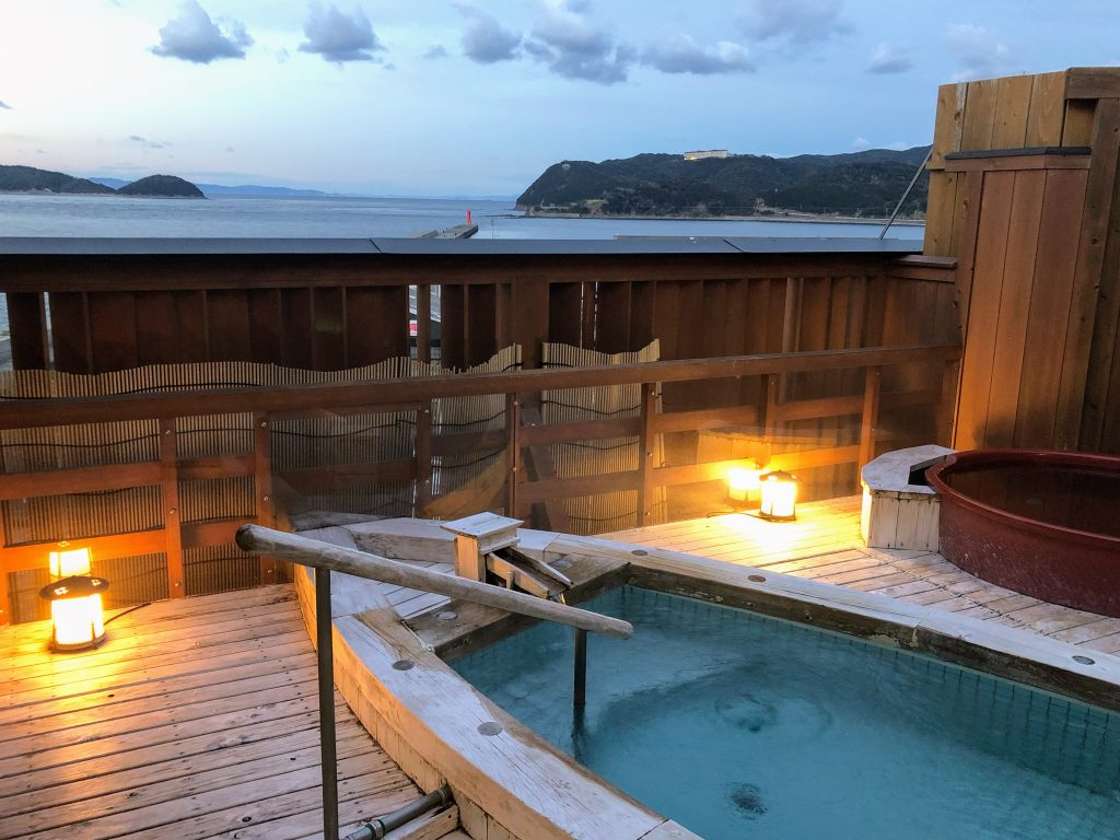 淡嶋温泉大阪屋ひいなの湯は夕陽の眺めが美しい露天風呂と新鮮な魚料理が自慢の宿。