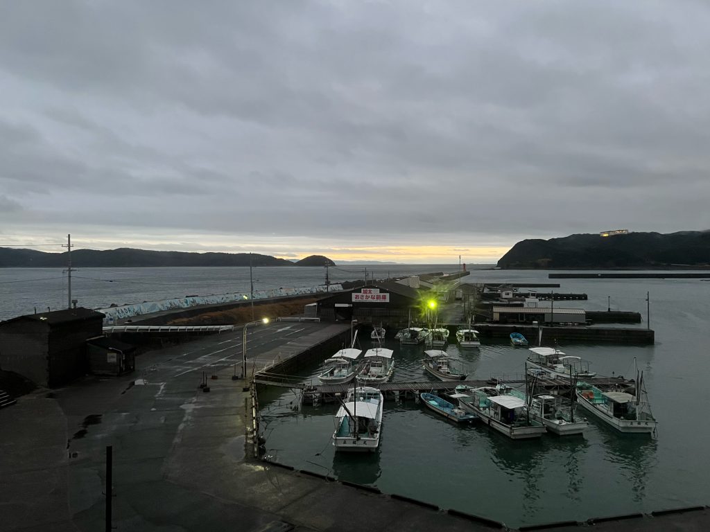 18時過ぎの小雨模様の加太漁港。