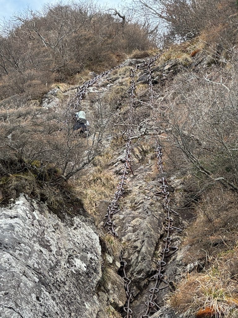 ほぼ垂直にそそり立つ鎖場を前に